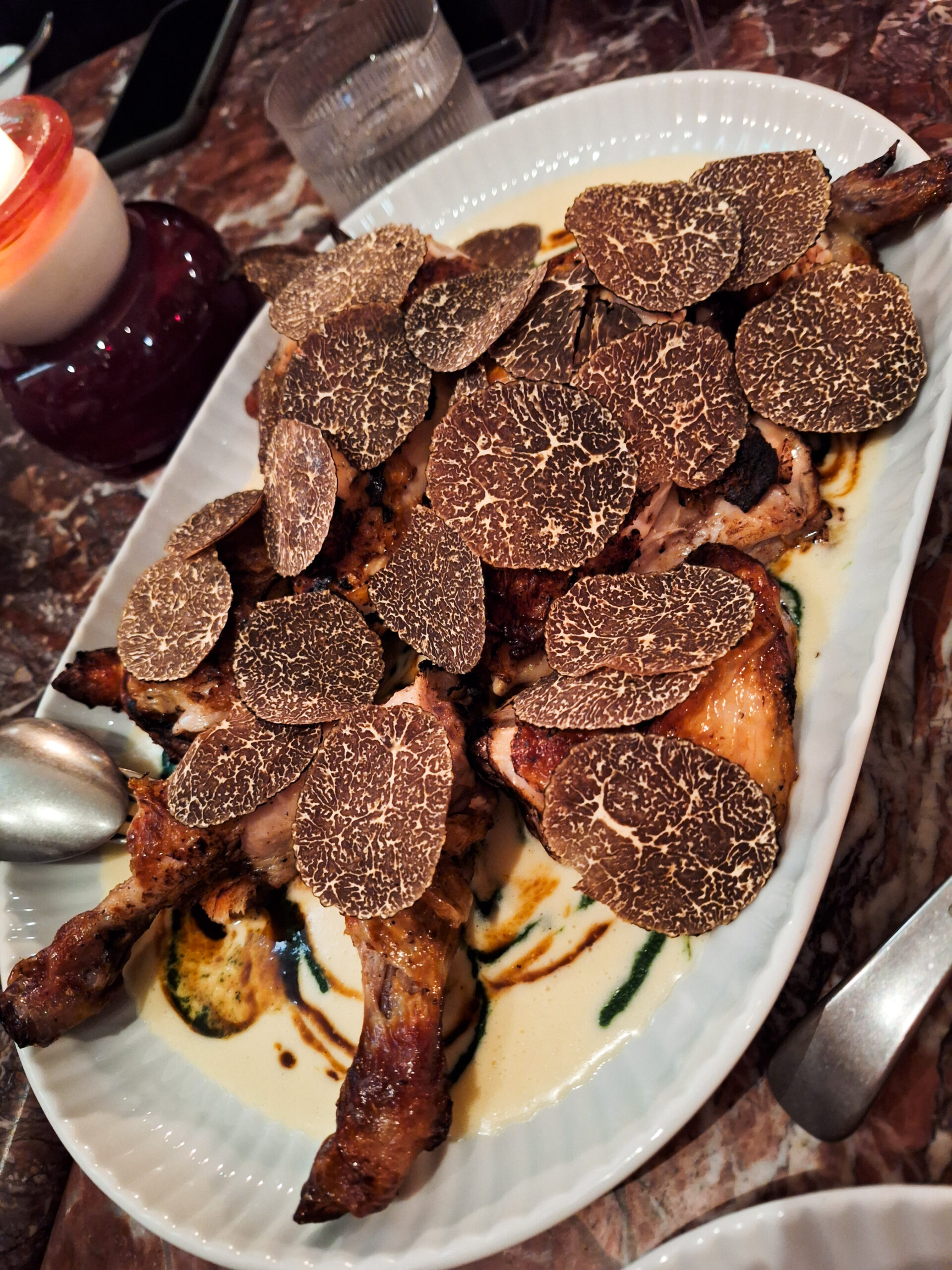 Αναφέρομαι στο ολόκληρο κοτόπουλο, μέσα σε beurre blanc, λάδι μαϊντανού, τρούφα και ρύζι στο πλάι.